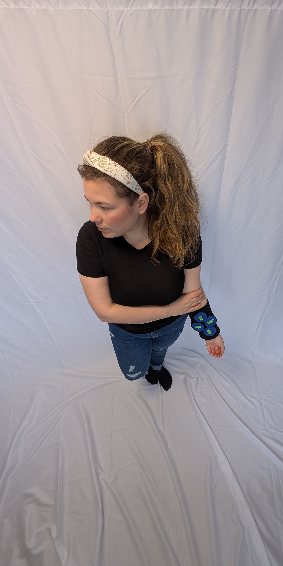 A wearable game controller with conductive fabric buttons and an Adafruit CPX, allowing arm movement-based controls.